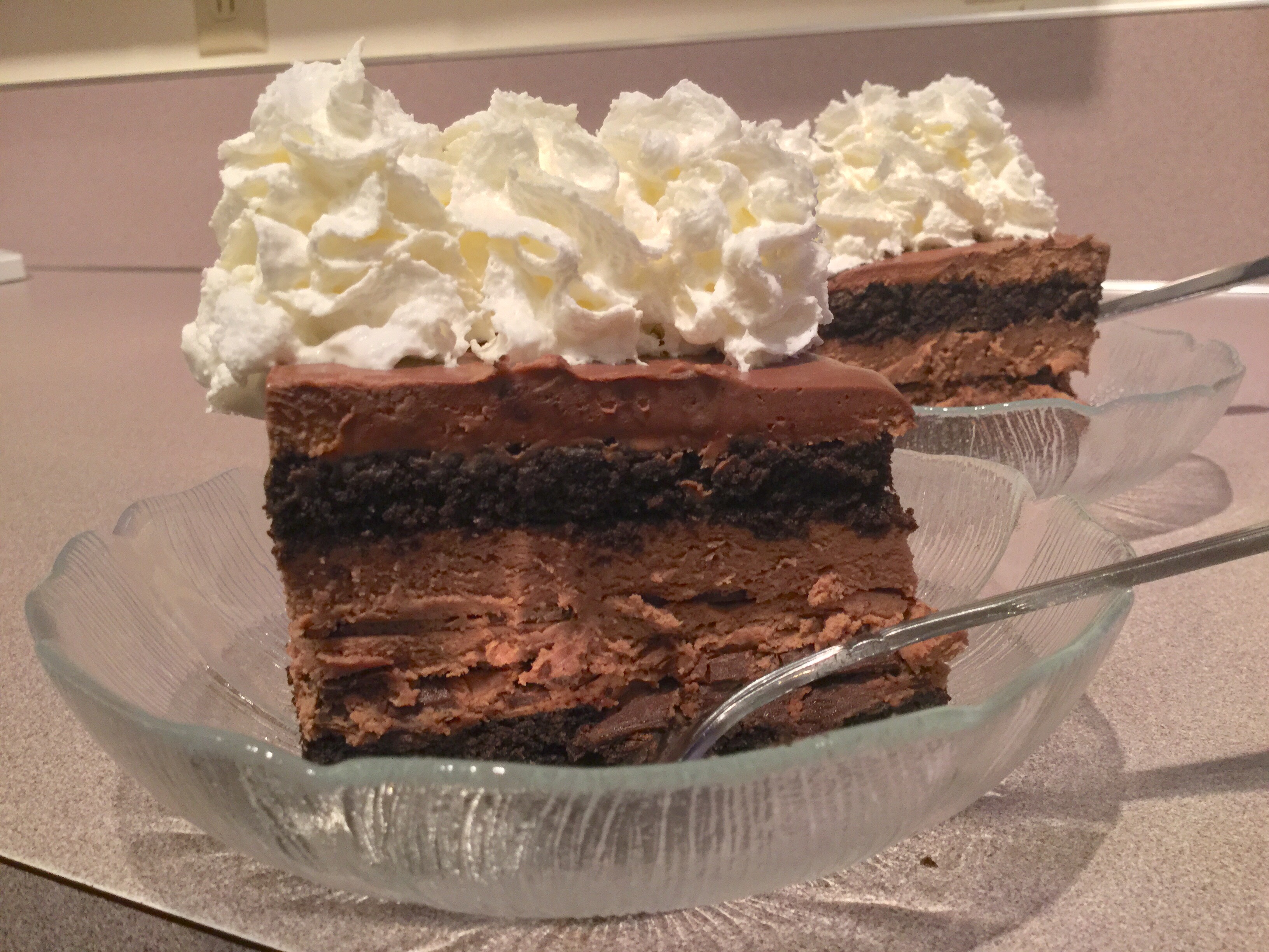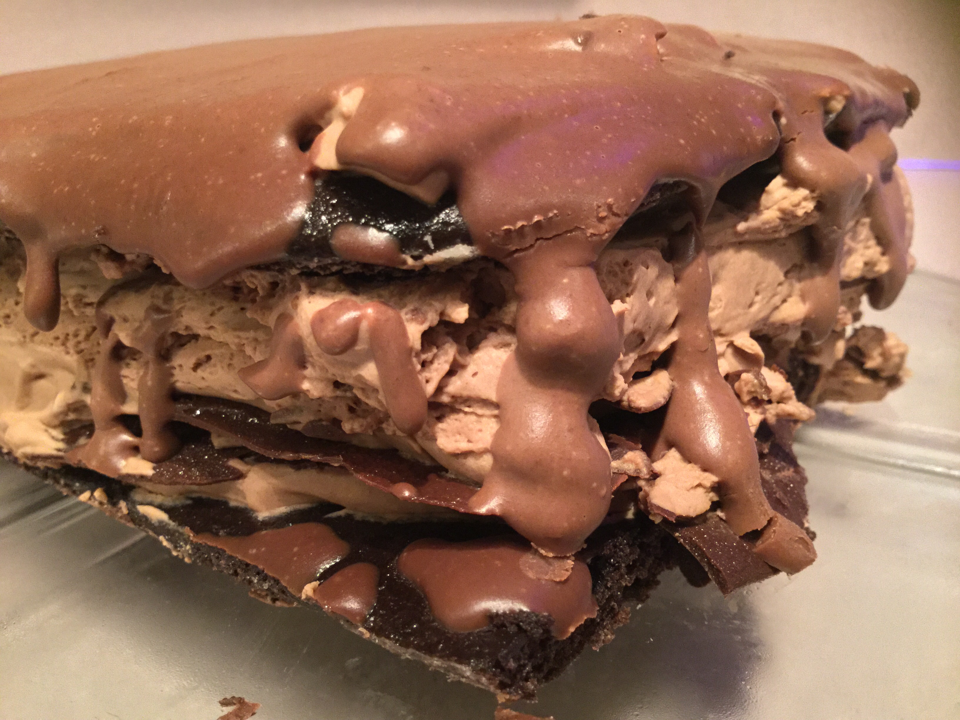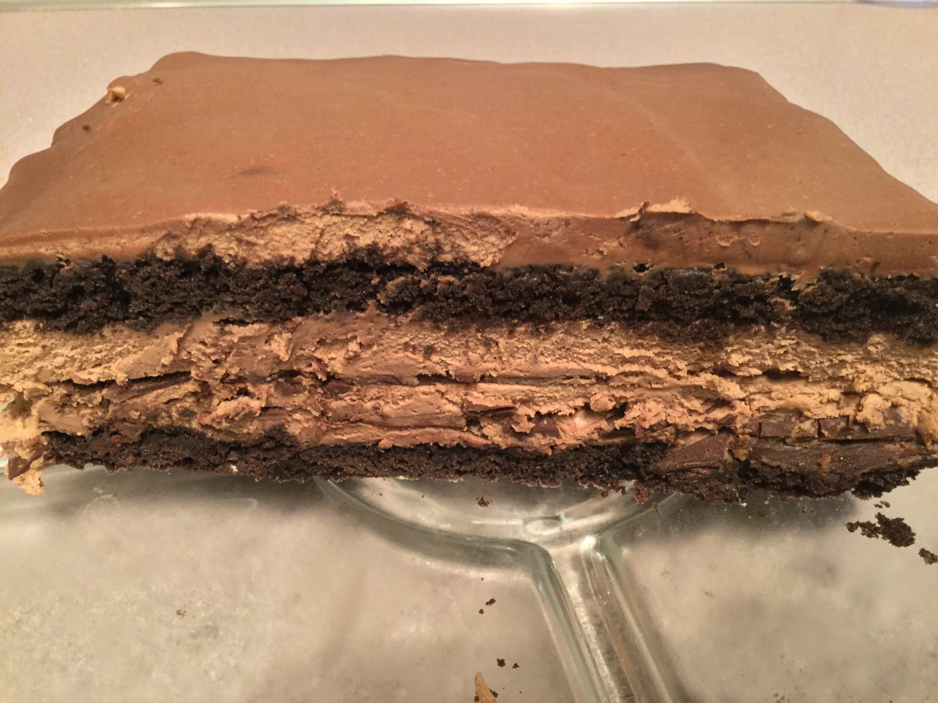 To make Devastating Chocolate Lasagna, you stack the components from the bottom up, in this order:
