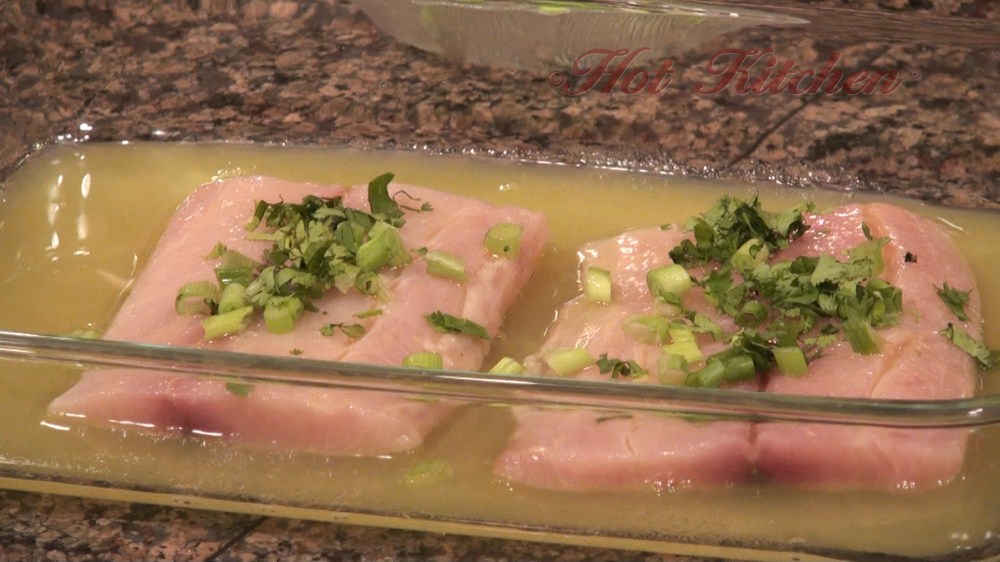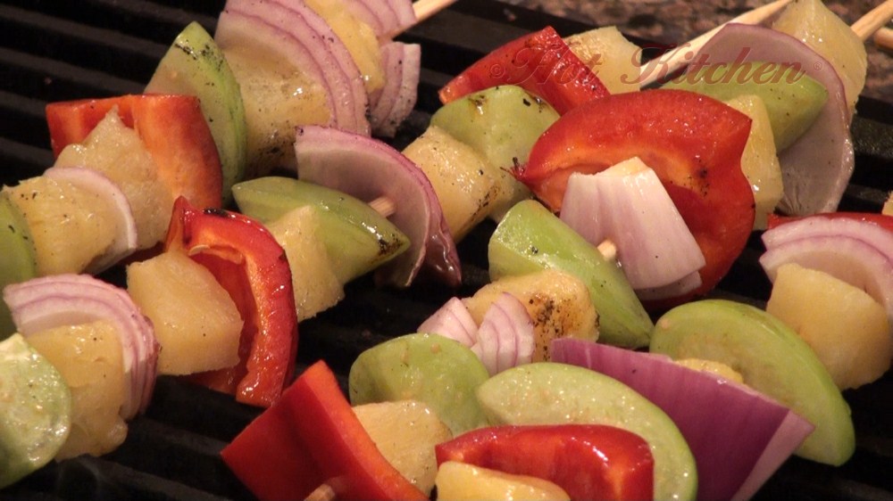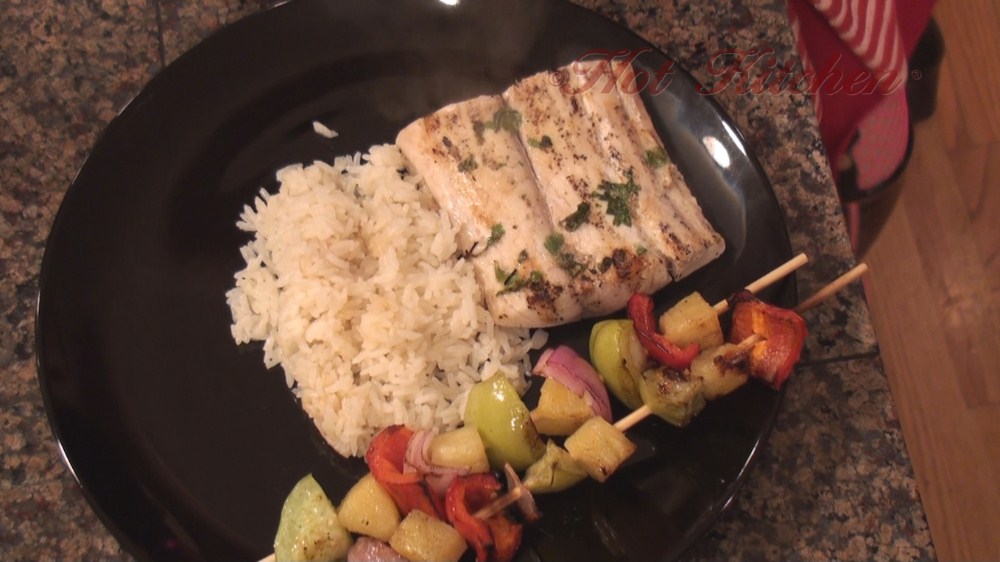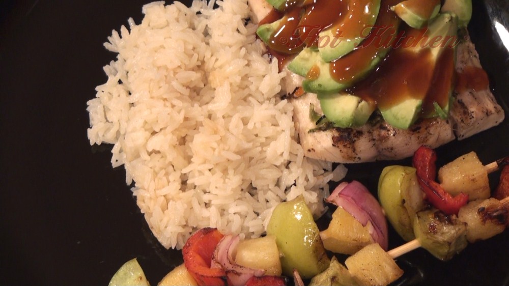 Green Avocado is fanned out over the pineapple juice marinated fish filets, and then they are drizzled with a tasty teriyaki-type sauce. On the side is addictive coconut rice and colorful fruit and veggie skewers.