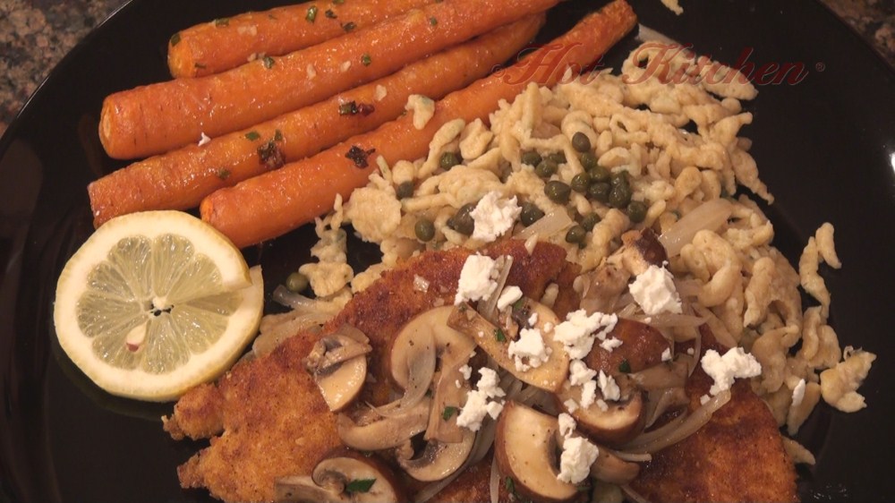 Chicken schnitzel is pounded, breaded, and pan fried to perfection in butter. Then we top it with mushroom reduction. Spaetzle is a unique side dish that is a dumpling that reminds one of pasta. Whole roasted carrots are slow roasted to draw out the sweetness — incidentally a simple way to prepare carrots.