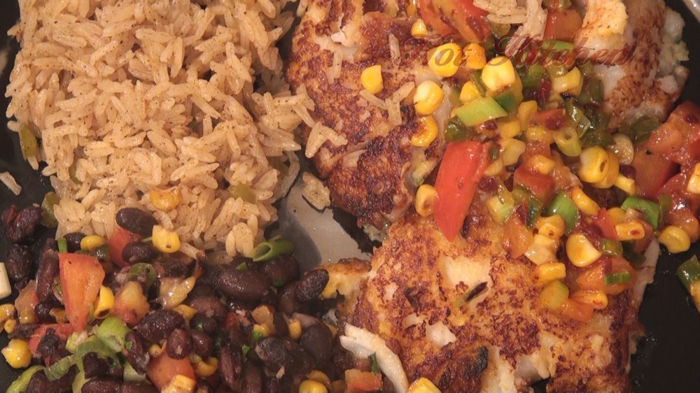 This Tex-Mex menu of recipes for two features battered fish, roasted corn, black beans, fresh salsa, and loaded cornbread.