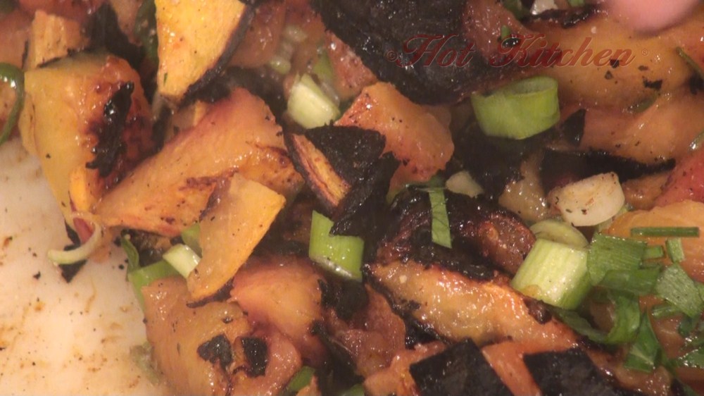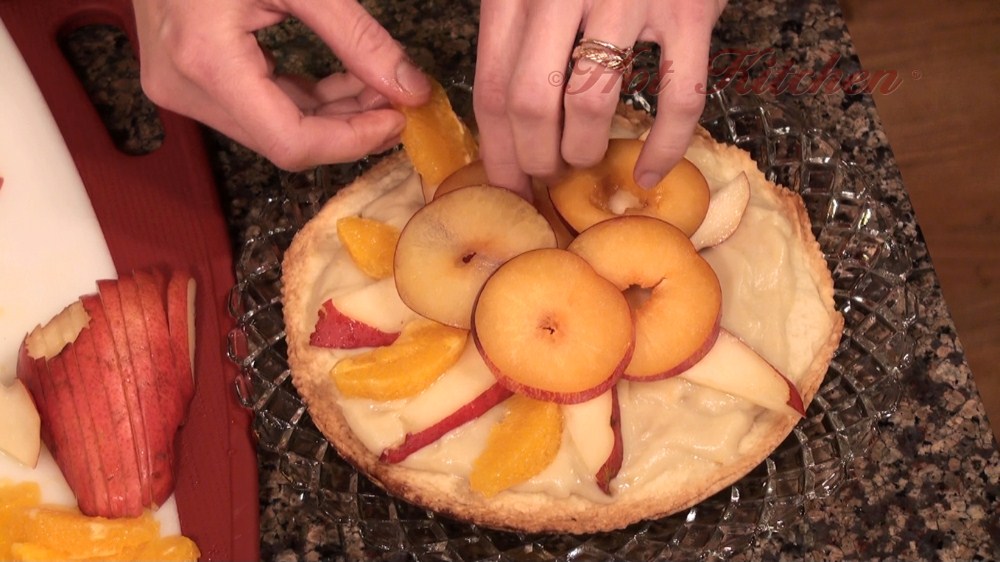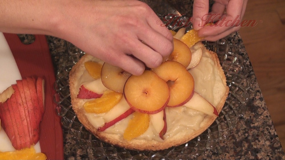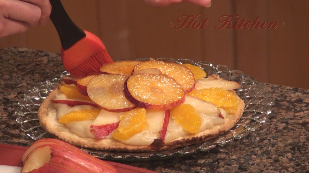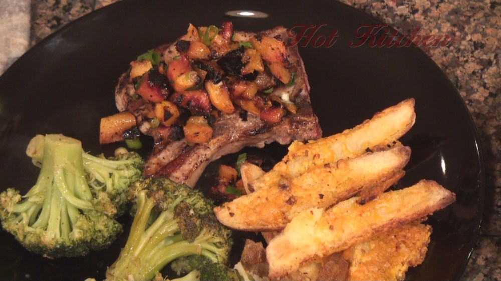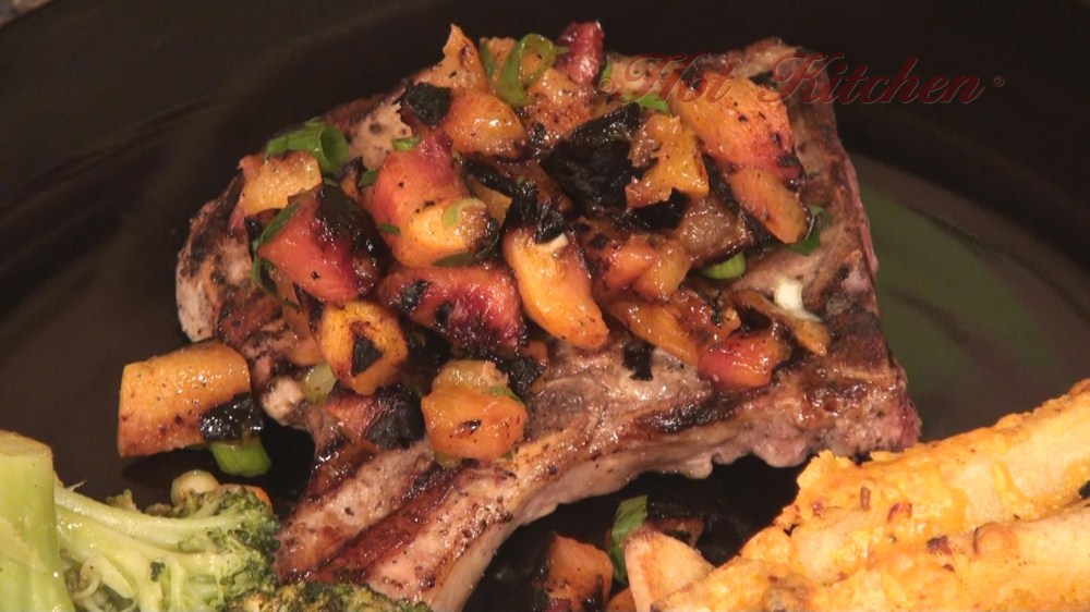 Grilled peach salsa compliments a smokey pork chop. To offset the sweetness, there are cheese crusted potatoes and broccoli with dijon butter. For dessert, a double almond sugar crust acts as the foundation to a fruit tart featuring the autumn harvest.
