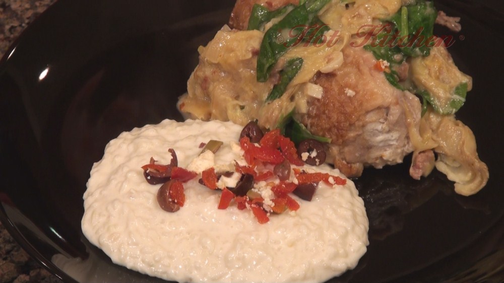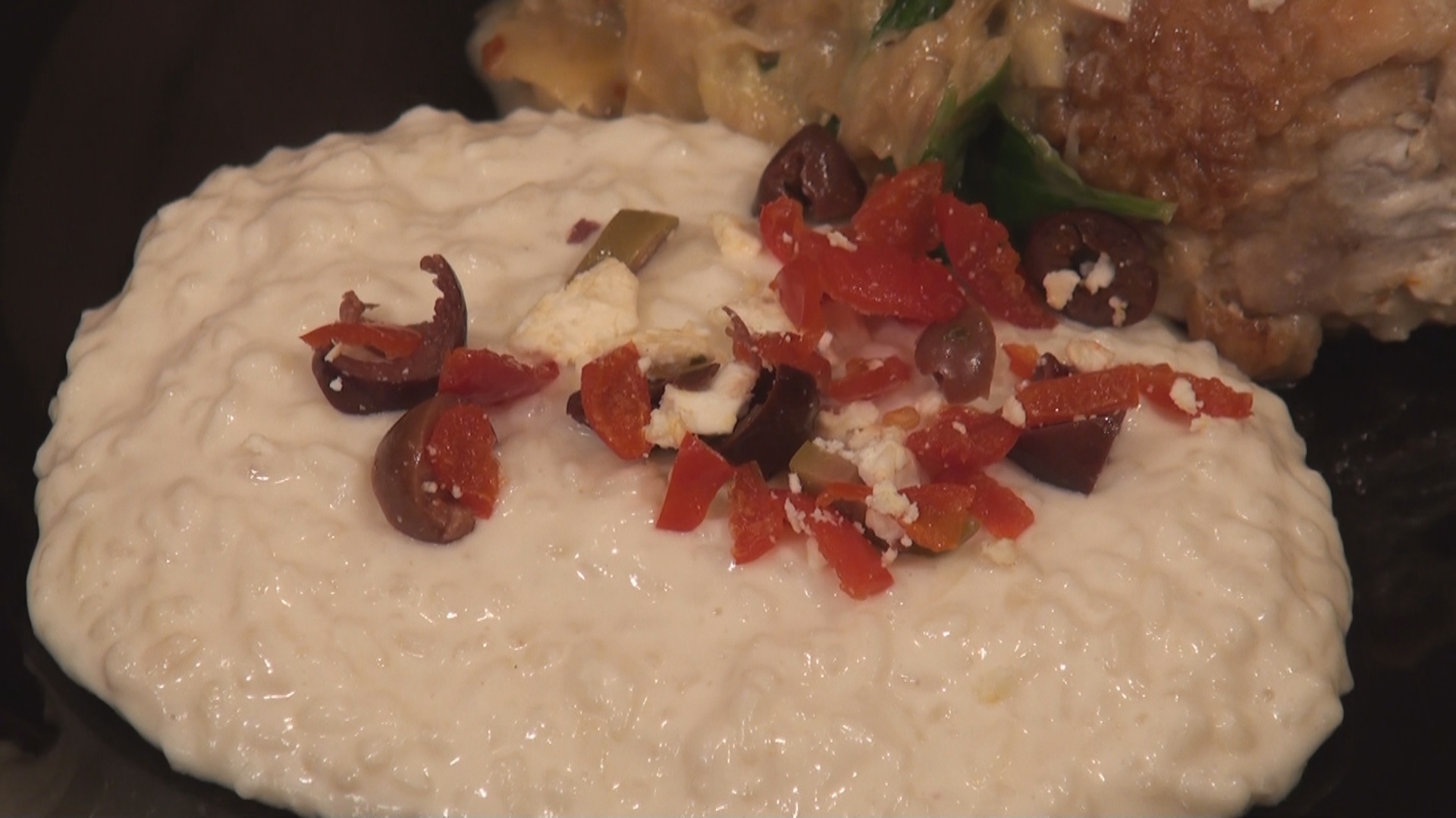 Creamy, smooth, and almost perfectly white cheesy risotto contrasts and balances the bright flavors.