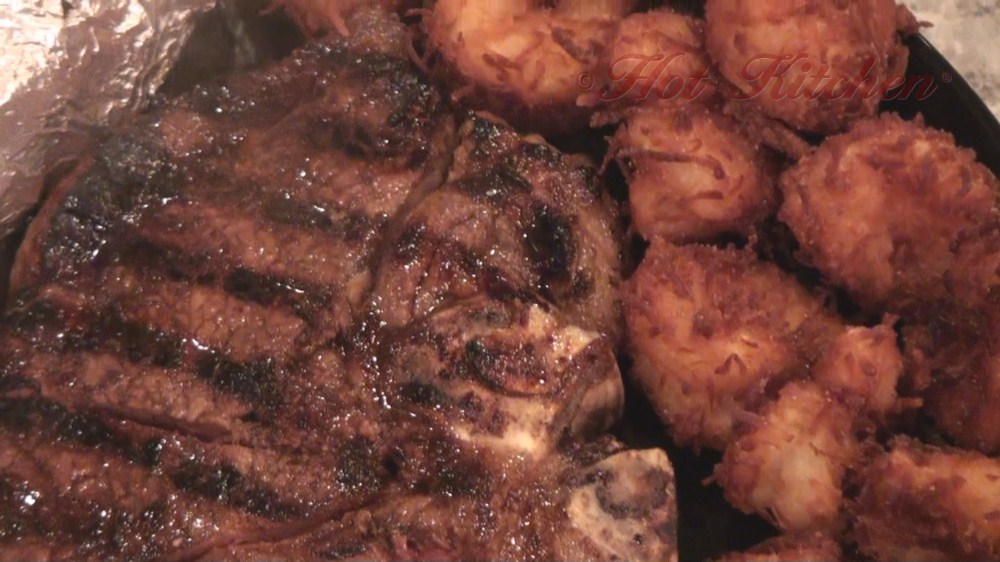 Juicy T-bone steak is paired with homemade coconut shrimp, a seasoned balsamic reduction serves as the marinade and basis for a dipping sauce so that all the flavors work together. Miniature red velvet cakes, called babycakes, will steal your heart! A feast like this is ideal for celebrating a special occasion like an anniversary or a birthday.