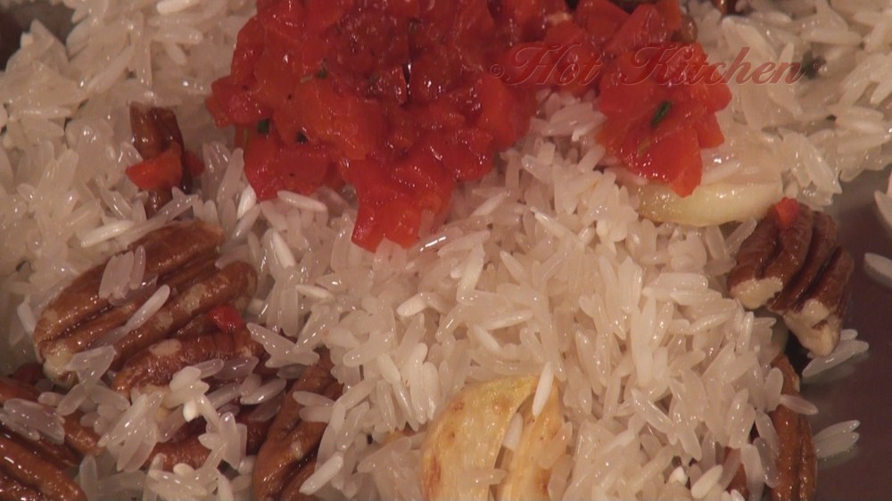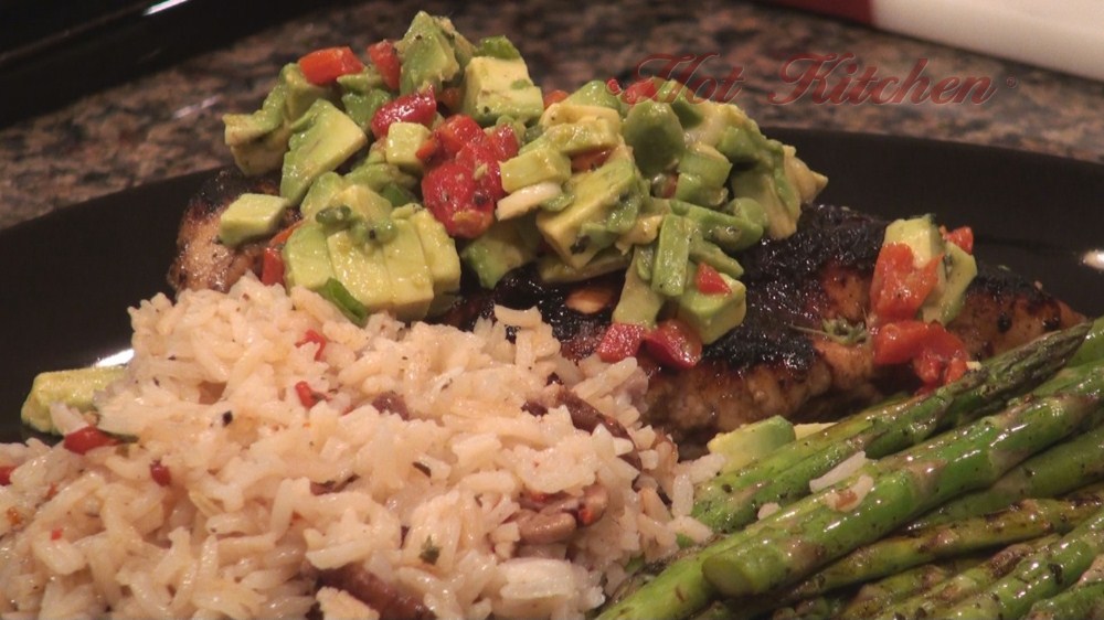 The chicken is marinated in a simple balsamic marinade that give the chicken a pleasing char. On the side is pecan rice pilaf and grilled asparagus. This dinner is perfect for a fast and easy summer date.