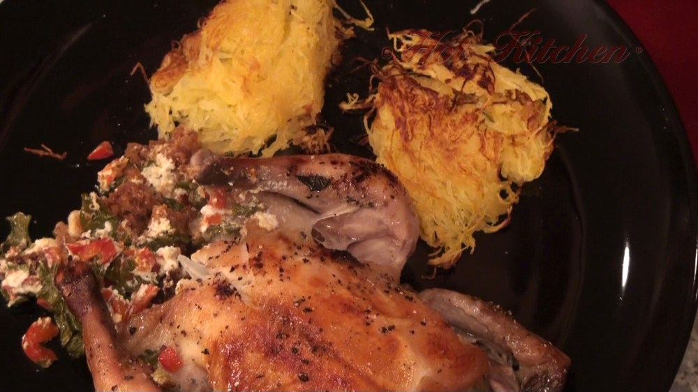On the side, humble spaghetti squash is transformed into a graceful side with suave use of the same goat cheese. To round it out is an apple salad with balsamic dressing.