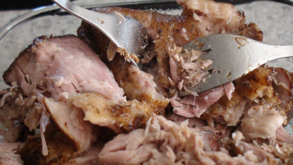 - Break it up with two forks. Remove any bones and chunks of hard fat.