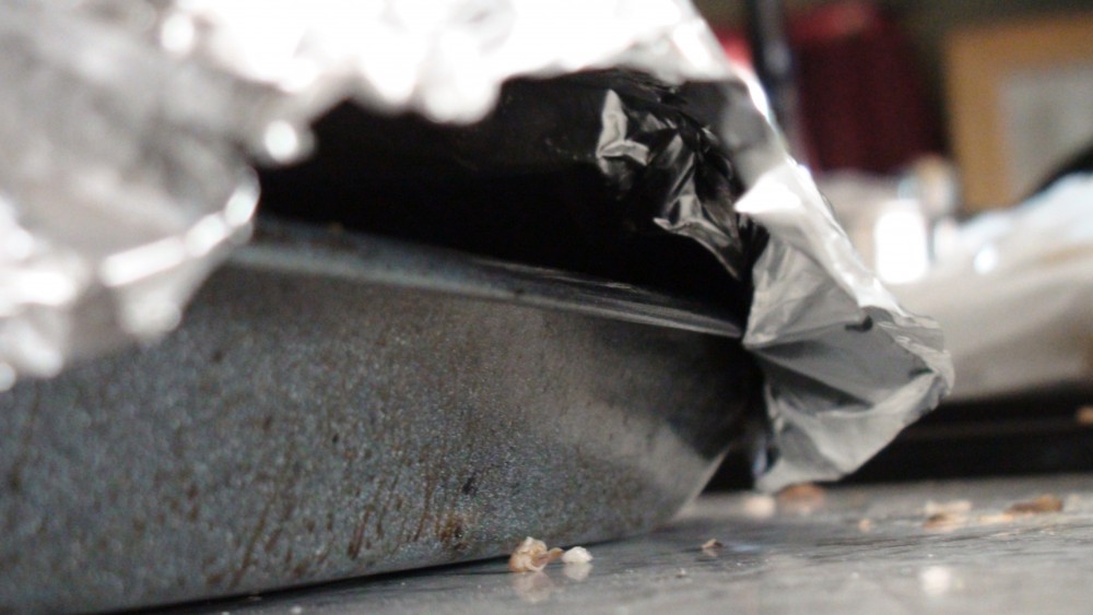 We are doing a half smoke by using indirect heat on the barbecue. I covered a metal pan in foil and pull the sides out so the smoke can enter the pan. The foil is like a little tent over the pan really. It is not as effective as actual smoking, but when you live in a little home, with a little kitchen, sometimes there are sacrifices to be made.